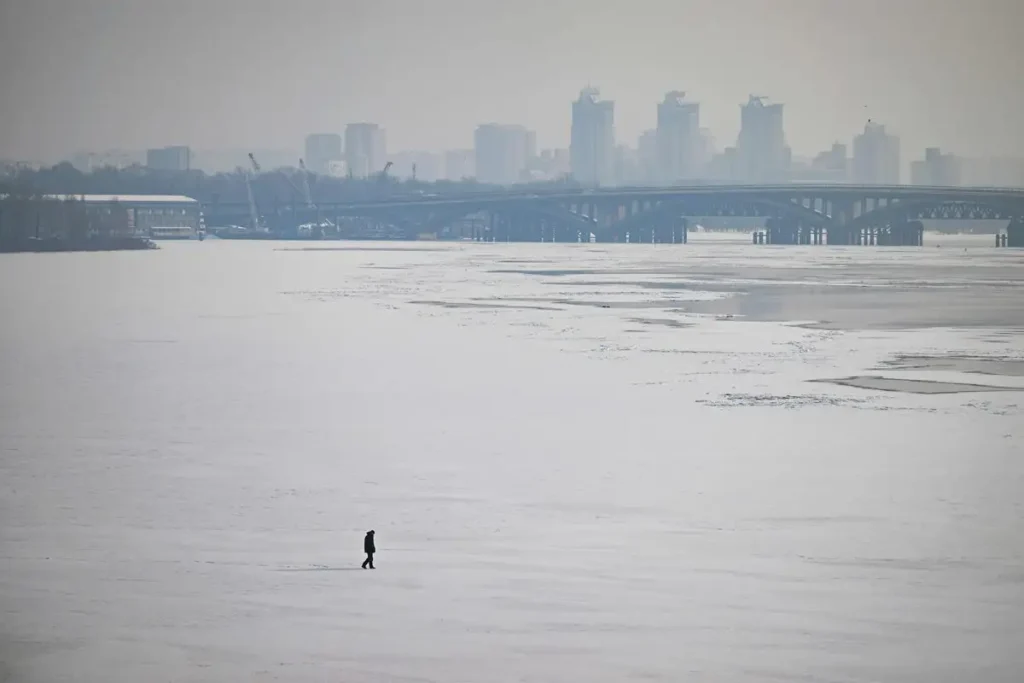 Kiev despierta bajo un invierno extremo marcado por la guerra. Un peatón avanza con cautela sobre el río Dniéper cubierto de hielo, una imagen que refleja tanto la dureza del clima como la resistencia cotidiana de la ciudad. En la capital ucraniana, la vida continúa entre sirenas, apagones y temperaturas bajo cero, mientras la invasión rusa sigue redefiniendo la rutina de millones de personas. El cruce silencioso sobre el río se vuelve un gesto simbólico: adaptación, valentía y esperanza en medio de la incertidumbre. En Kiev, incluso el frío se enfrenta con determinación y dignidad. ❄️🚶‍♂️
